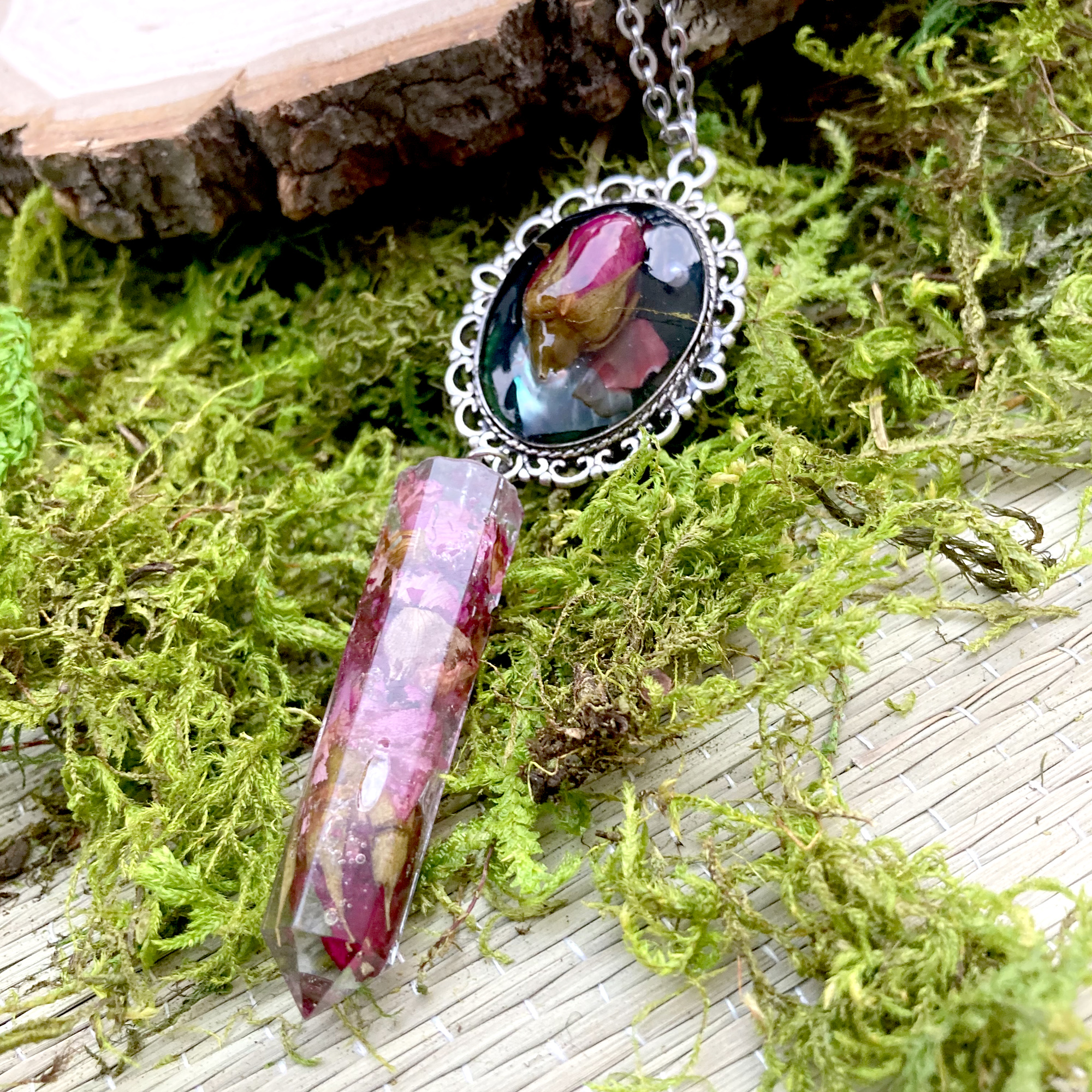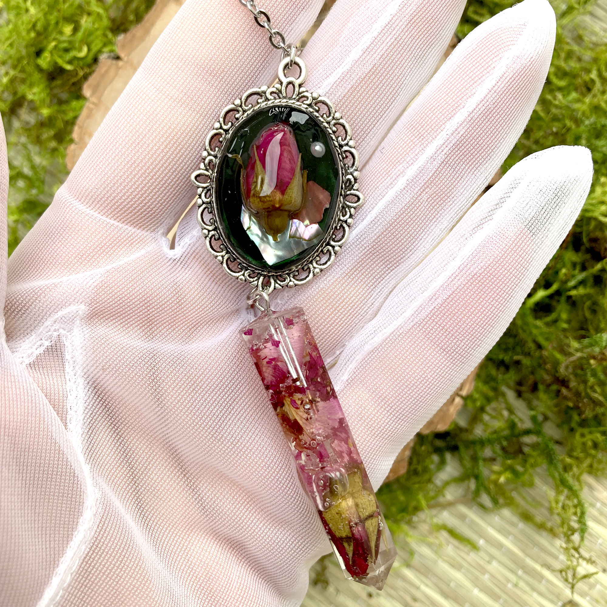 Handmade resin charms with floating dried rosebuds, abalone, and a faux pearl. On an 18" stainless steel necklace.