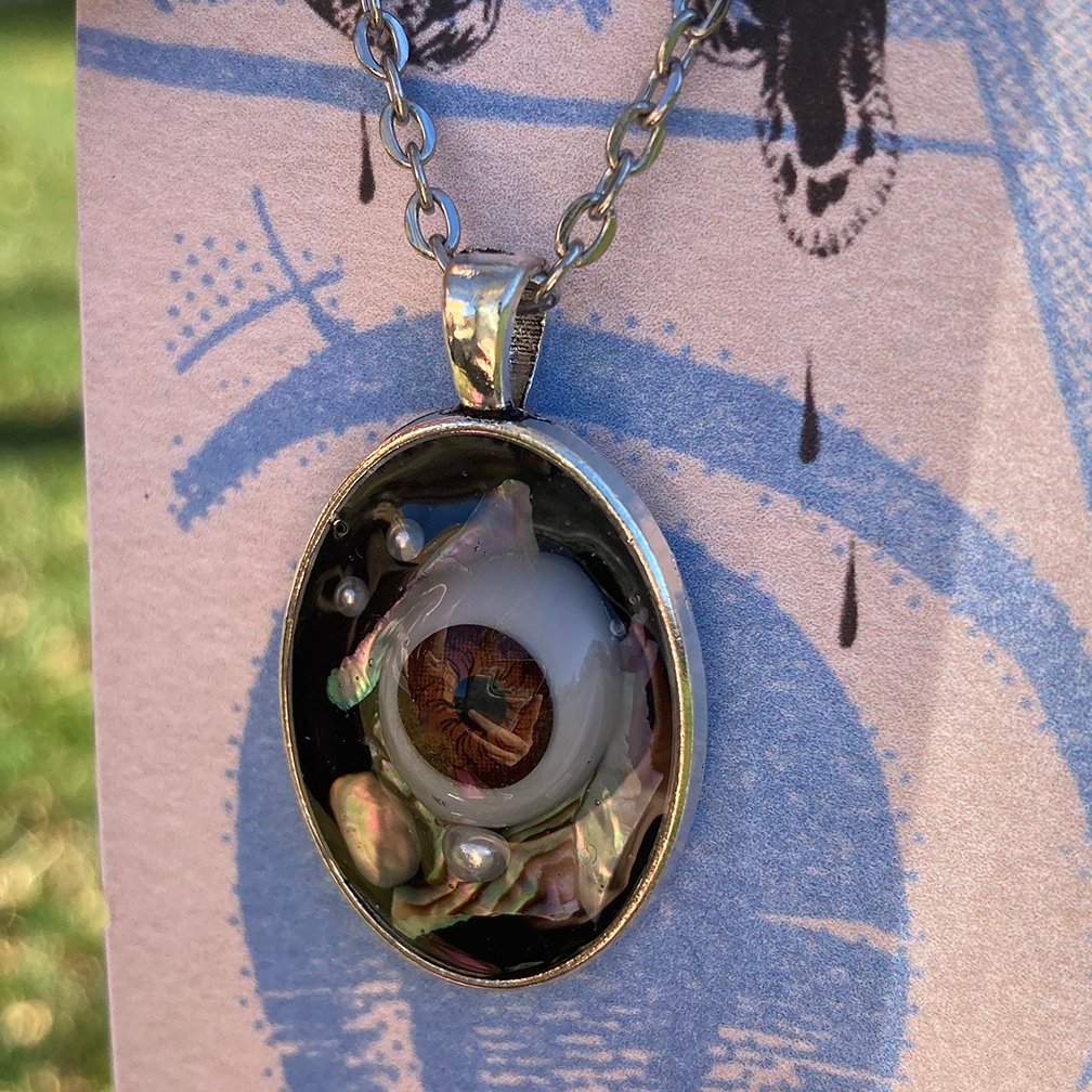 Brown eye, faux pearls, and abalone floating in resin. On an 18" stainless steel necklace.