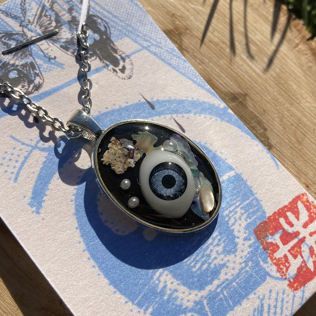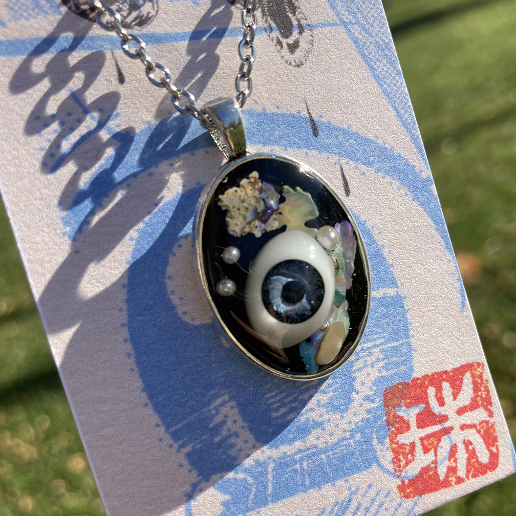 Blue eye, faux pearls, and abalone floating in resin. On an 18" stainless steel necklace.