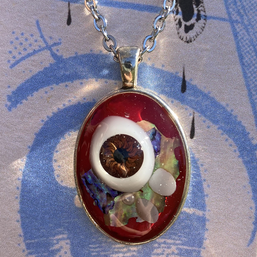 Brown eye, faux pearls, and abalone floating in resin. On an 18" stainless steel necklace.