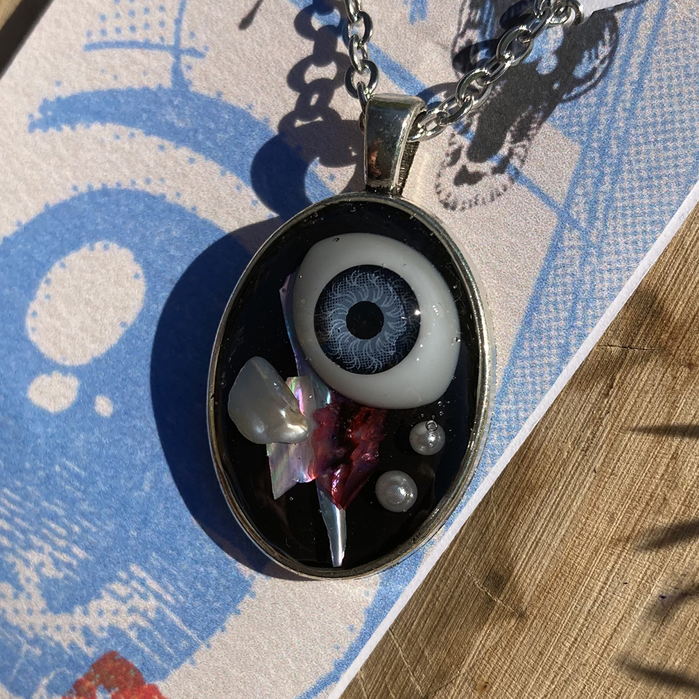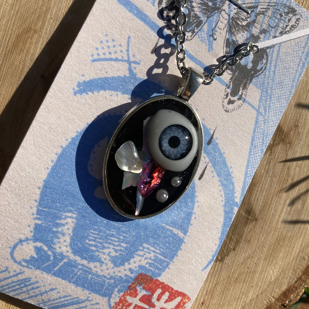 Blue eye, faux pearls, and abalone floating in resin. On an 18" stainless steel necklace.