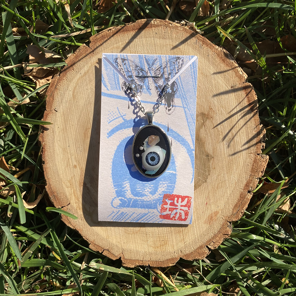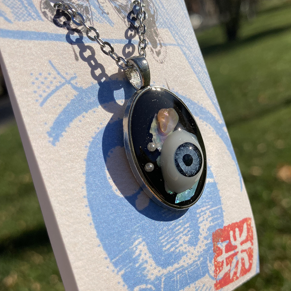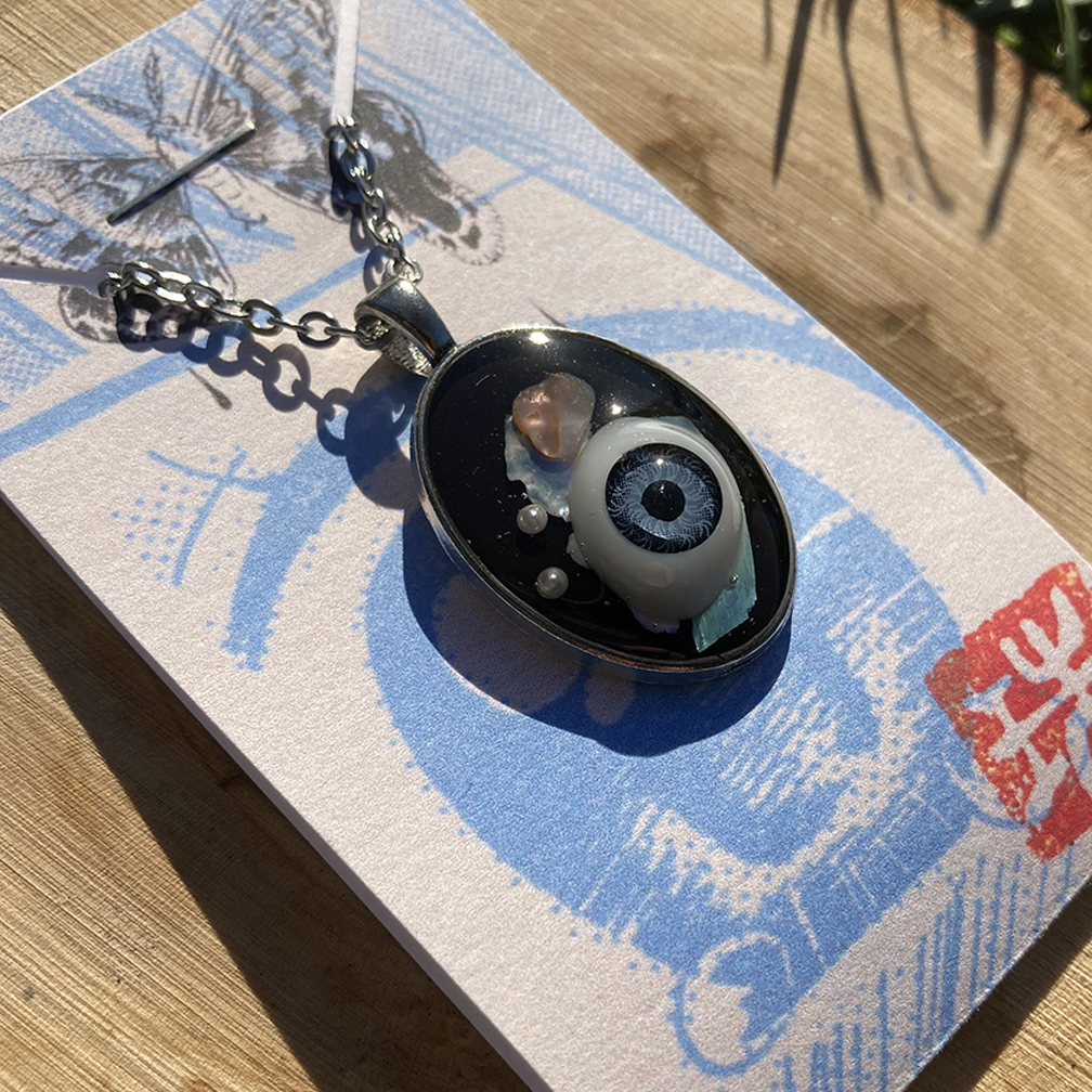 Blue eye, faux pearls, and abalone floating in resin. On an 18" stainless steel necklace.